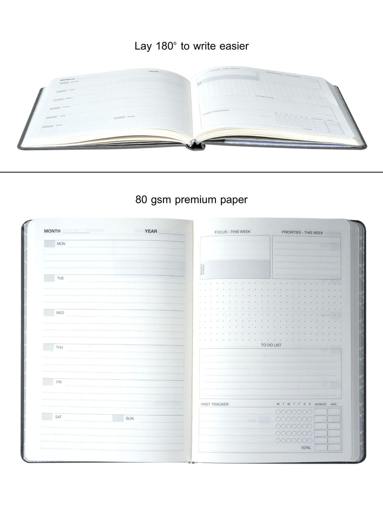 - WEEKLY PLANNER, ORGANIZE YOURSELF & BOOST PRODUCTIVITY : This weekly planner is designed to help you boost your productivity and organize yourself. It comes with a weekly spread, monthly spread, and a monthly review.