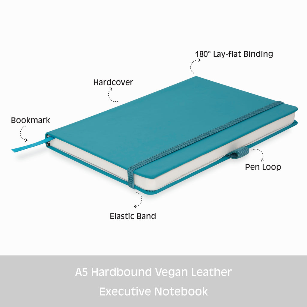 - PU Leather Hardcover: A5 Hardbound Vegan Leather Executive Notebook with Pen Loop, inner expandable pocket and Elastic Band. PU leather is durable and water resistant so even if droplets accidentally splash on the notebook cover, there is no need to worry. Pro Series Notebooks come in various colours to suit your aesthetics.