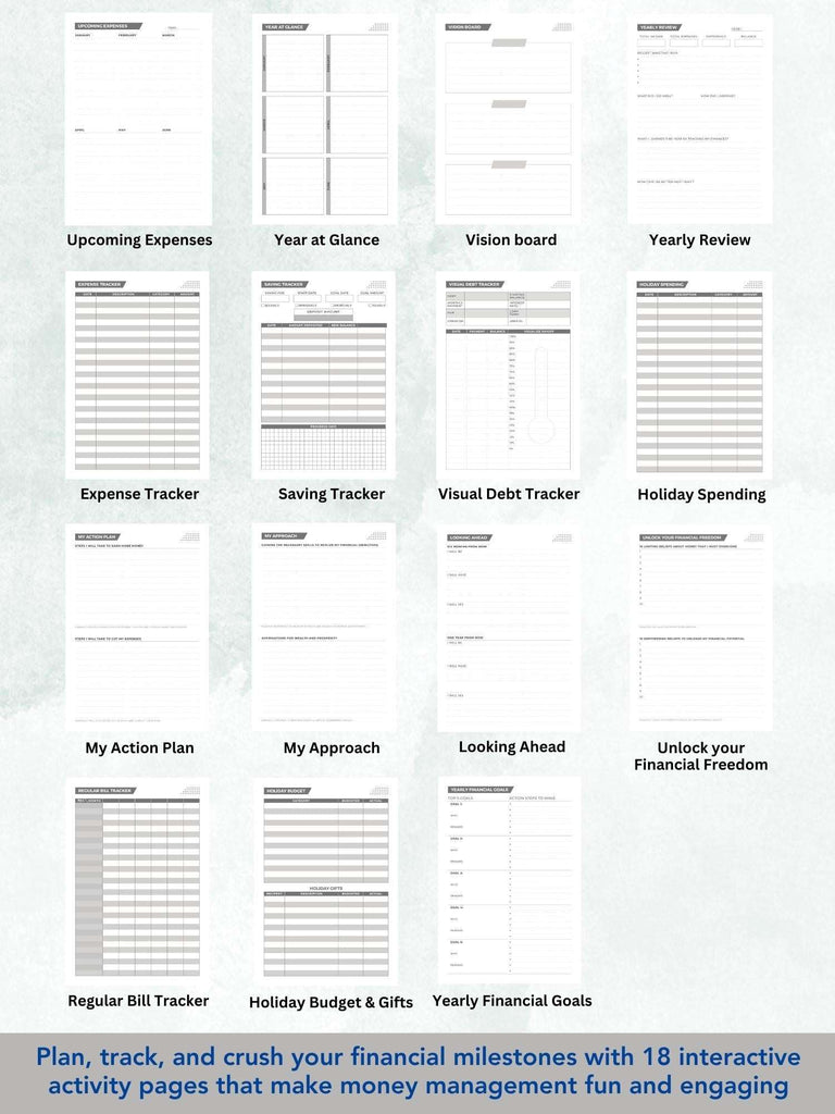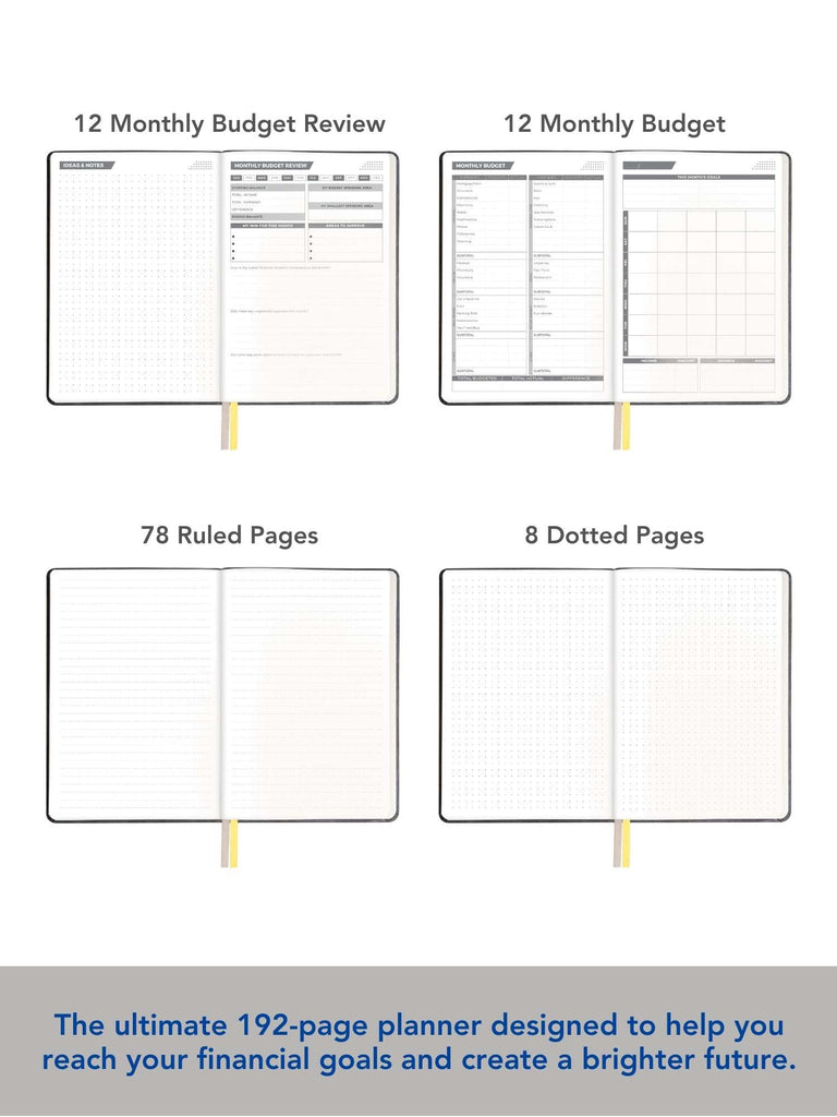 • [ONE TOOL FOR FINANCIAL GOALS]: Incorporates 18 activity pages, 12 undated monthly planners, savings and visual debt trackers, holiday budget, spending mapping sections, 78 Ruled Pages, 8 Dotted Pages.