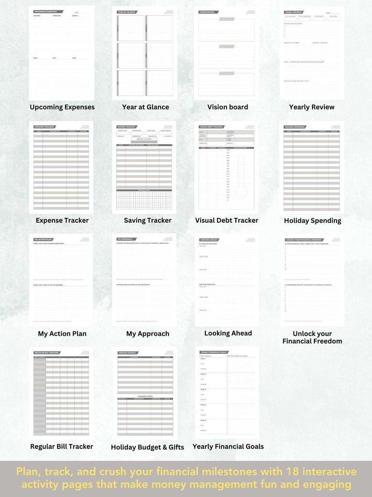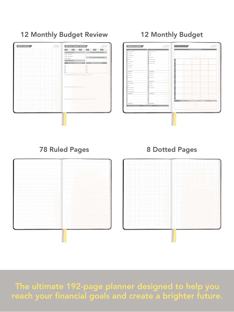 • [ONE TOOL FOR FINANCIAL GOALS]: Incorporates 18 activity pages, 12 undated monthly planners, savings and visual debt trackers, holiday budget, spending mapping sections, 78 Ruled Pages, 8 Dotted Pages.