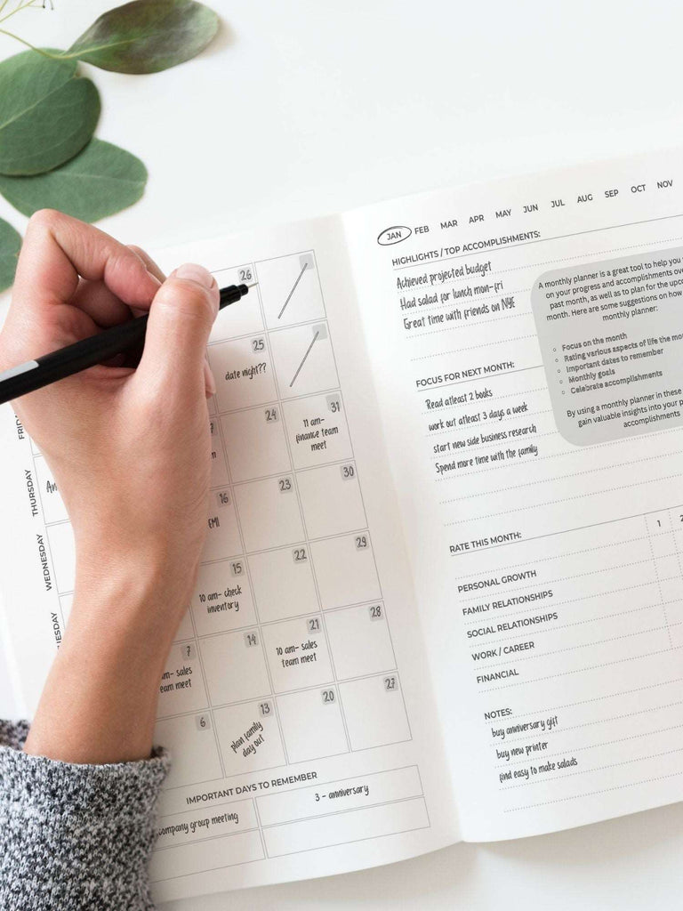 • WEEKLY PLANNER, ORGANIZE YOURSELF & BOOST PRODUCTIVITY : This weekly planner is designed to help you boost your productivity and organize yourself. It comes with a weekly spread, monthly spread, and a monthly review.