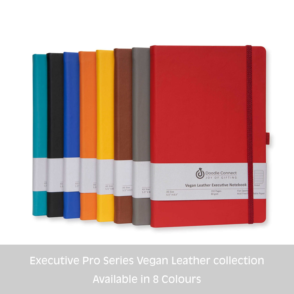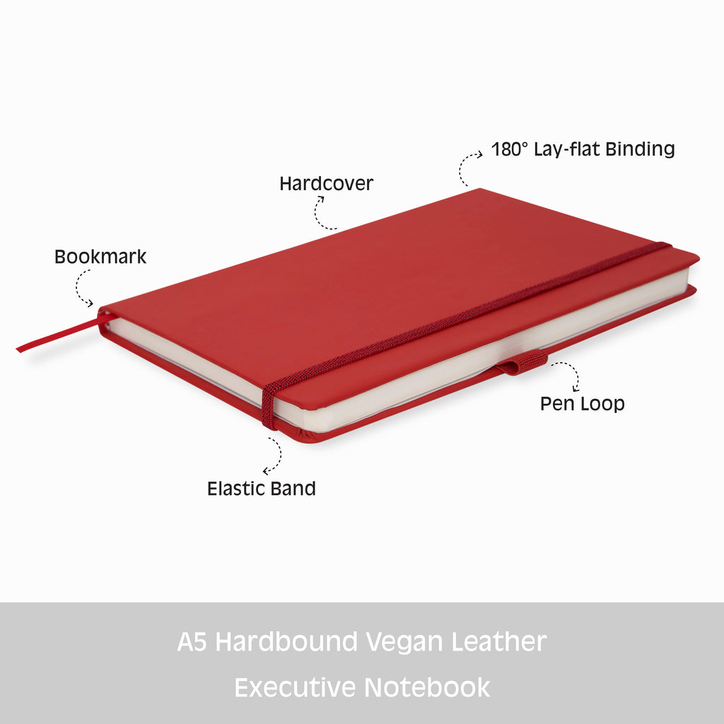 • PU Leather Hardcover: A5 Hardbound Vegan Leather Executive Notebook with Pen Loop, inner expandable pocket and Elastic Band. PU leather is durable and water resistant so even if droplets accidentally splash on the notebook cover, there is no need to worry. Pro Series Notebooks come in various colours to suit your aesthetics.